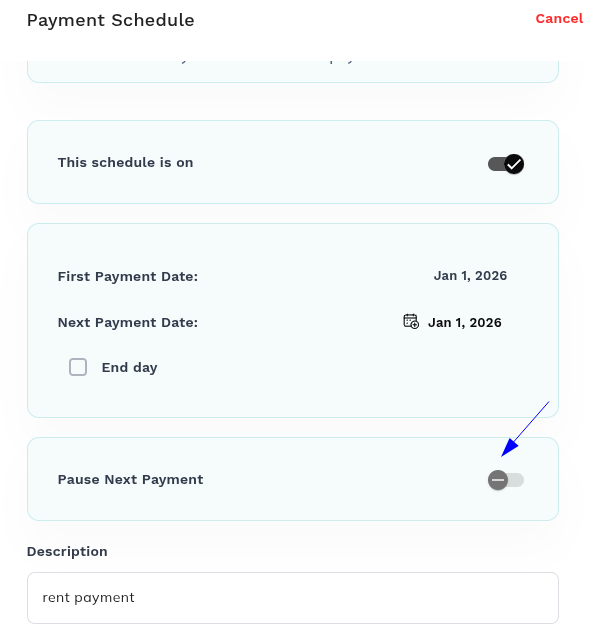 If you have a schedule but want to pause it for one month you can go to the scheduled payment.
