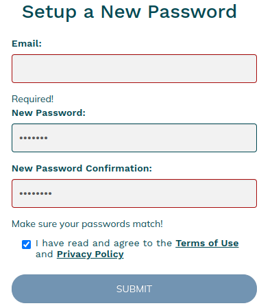 - The following form will come up to set up a new password. (The password must be minimum 6 characters)
