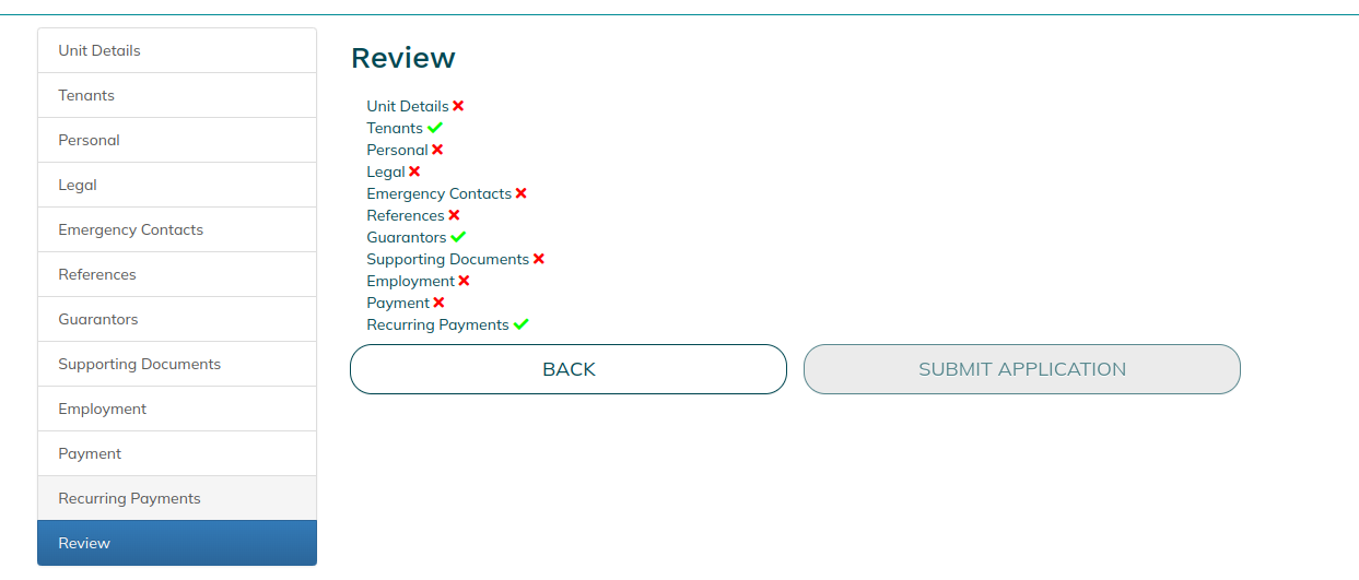 - Once the application is complete on the review screen there should be green check marks on all sections. This will indicate what is still missing from the Application.